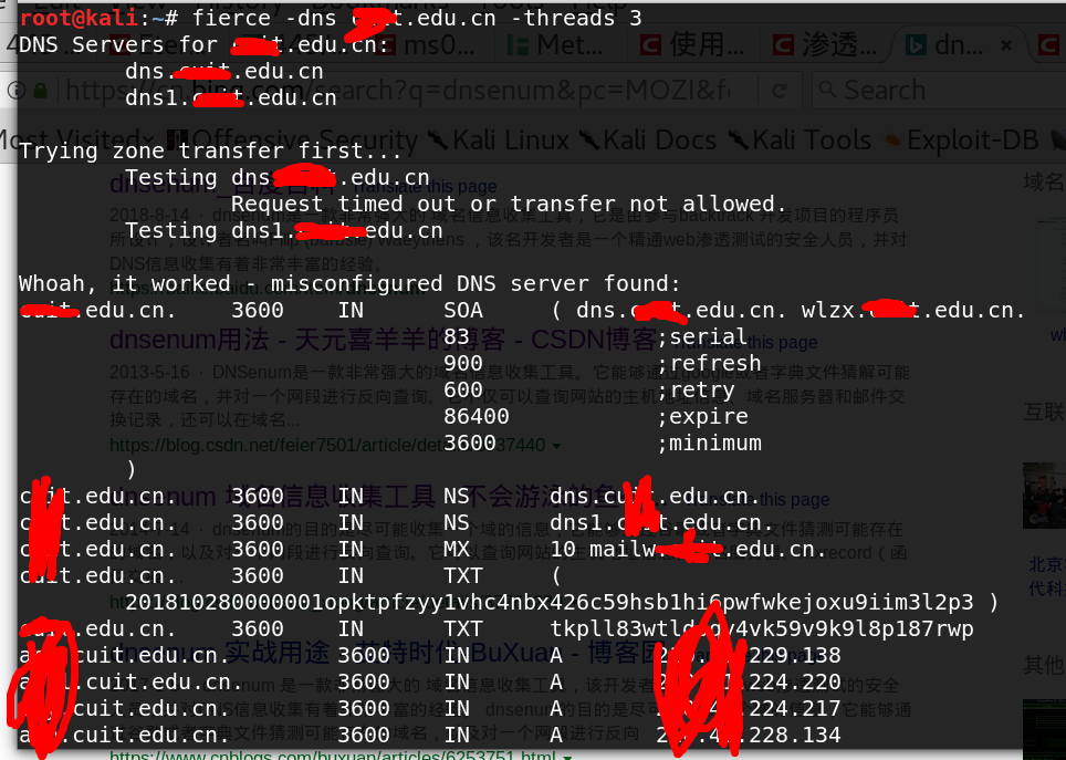 DNS枚举工具,可通过多项技术查找目标的ip地址和主机名,他会通过本机使用的DNS服务器查找使用个目标域的DNS服务器;也可以进行暴力破解子域名