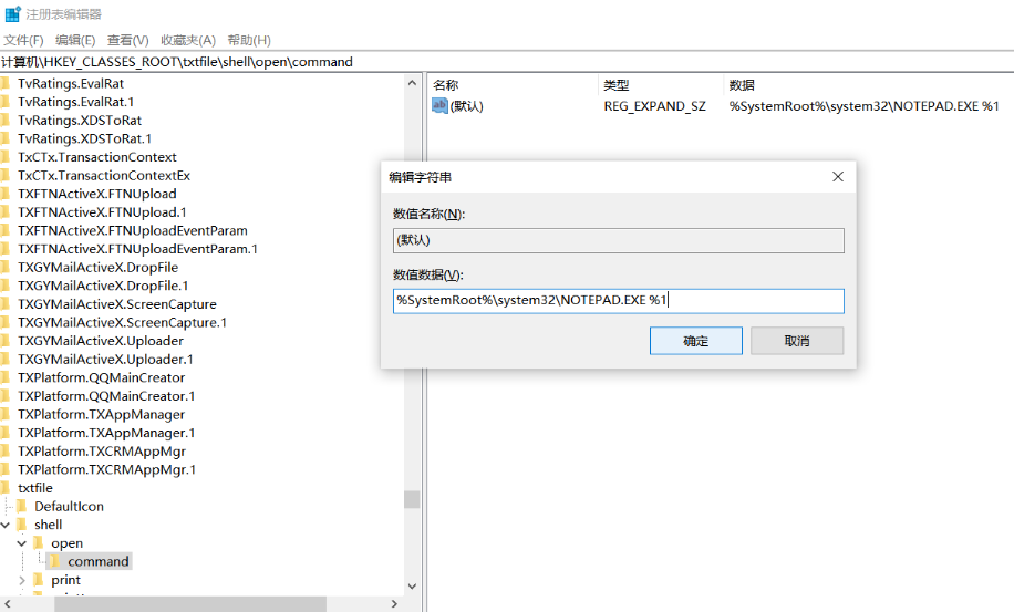 计算机\HKEY_CLASSES_ROOT\txtfile\shell\open\command