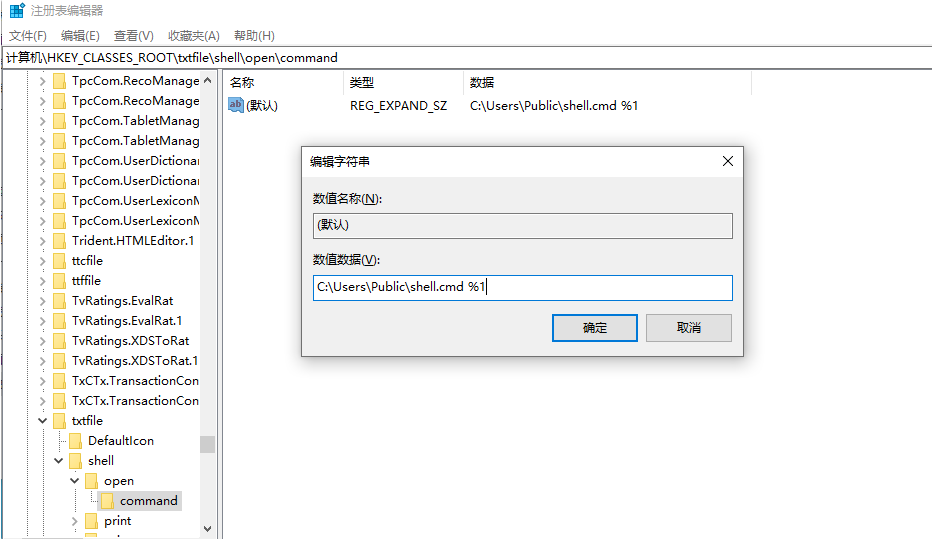 计算机\HKEY_CLASSES_ROOT\txtfile\shell\open\command 至 c:\tools\shell.cmd %1