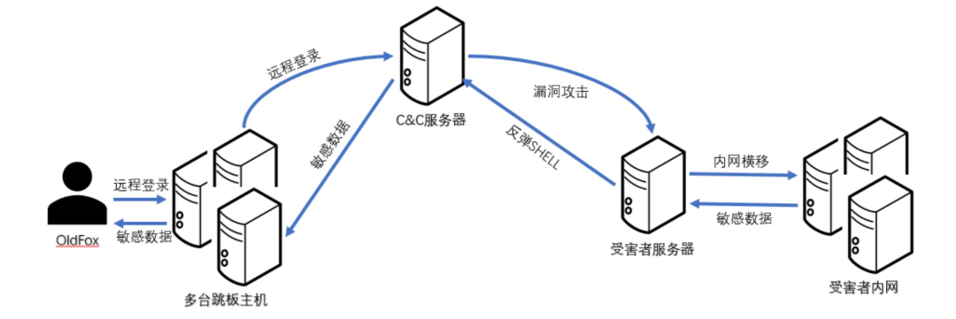 OldFox 通常利用 Web 侧漏洞、暴破等方式入侵目标企业的 Web 服务器,在部署自制后门木马(基于开源工具 PRISM 后门)后,伺机在企业内网进行横向移动,窃取用户数据、内部文档等敏感信息,危害程度极高。