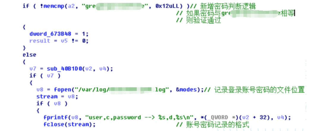 以 sshd 为例,木马化 sshd 存有后门密码,并且会记录所有 ssh 登录的用户名和密码。
