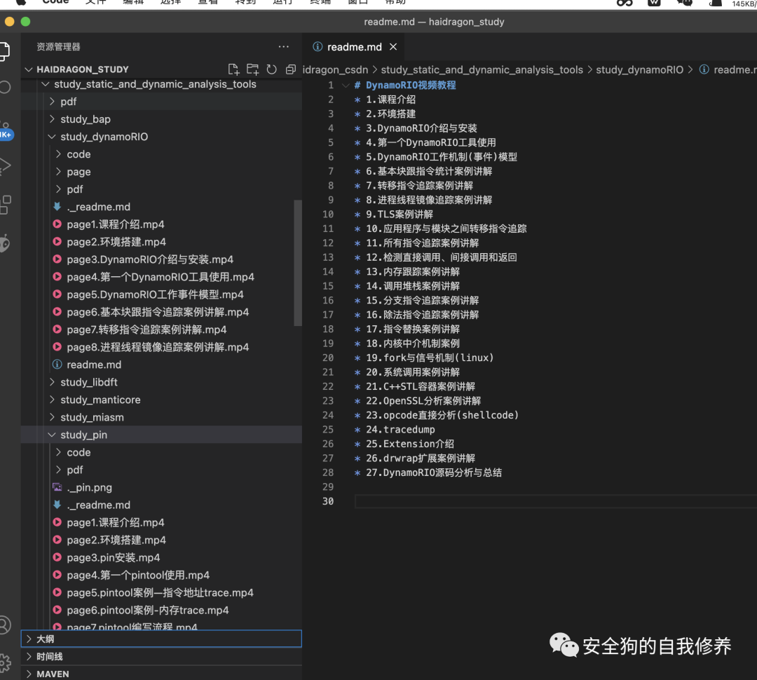 # DynamoRIO视频教程* 1.课程介绍* 2.环境搭建* 3.DynamoRIO介绍与安装* 4.第一个DynamoRIO工具使用* 5.DynamoRIO工作机制(事件)模型* 6.基本块跟指令统计案例讲解* 7.转移指令追踪案例讲解* 8.进程线程镜像追踪案例讲解* 9.TLS案例讲解* 10.应用程序与模块之间转移指令追踪* 11.所有指令追踪案例讲解* 12.检测直接调用、间接调用和返回* 13.内存跟踪案例讲解* 14.调用堆栈案例讲解* 15.分支指令追踪案例讲解* 16.除法指令追踪案例讲解* 17.指令替换案例讲解* 18.内核中介机制案例* 19.fork与信号机制(linux)* 20.系统调用案例讲解* 21.C++STL容器案例讲解* 22.OpenSSL分析案例讲解* 23.opcode直接分析(shellcode)* 24.tracedump* 25.Extension介绍* 26.drwrap扩展案例讲解* 27.DynamoRIO源码分析与总结