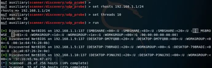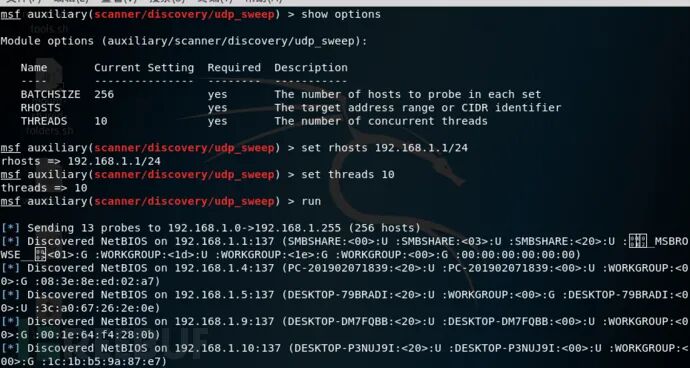 auxiliary (辅助)/ scanner(扫描)/discovery(发现)/udp_probe(探测)/udp_sweep(彻底搜索)