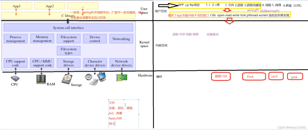 open,read,write,fork,pthread,socket由此处封装实现,由写的应用程序调用,C库中的各种API调用的是内核态,支配内核干活。内核态: