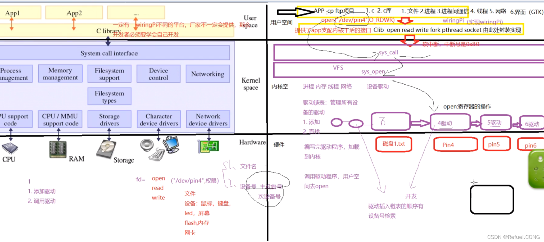 open("/dev/pin4",O_RDWR); 调用/dev下的pin4以可读可写的方式打开,**==对于上层open调用到内核时会发生一次软中断中断号是0X80,从用户空间进入到内核空间==**system_call(内核函数),system_call会根据/dev/pin4设备名,去找出你要的设备号。sys_open,sys_open会找到在驱动链表里面,根据主设备号和次设备号找到引脚4里的open函数,我们在引脚4里的open是对寄存器操作我们写驱动无非就是做添加驱动:添加驱动做哪些事呢?