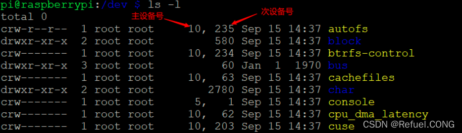 Linux的设备管理是和文件系统紧密结合的,各种设备都以文件的形式存放在/dev目录下,称为 ==设备文件==。应用程序可以打开、关闭和读写这些设备文件,完成对设备的操作,就像操作普通的数据文件一样。为了管理这些设备,系统为设备编了号,每个设备号又分为==主设备号== 和 ==次设备号==(如下图所示:)。主设备号用来区分不同种类的设备,而次设备号用来区分同一类型的多个设备。对于常用设备,Linux有约定俗成的编号,如硬盘的主设备号是3。一个字符设备或者块设备都有一个主设备号和次设备号。**==主设备号和次设备号统称为设备号==**。