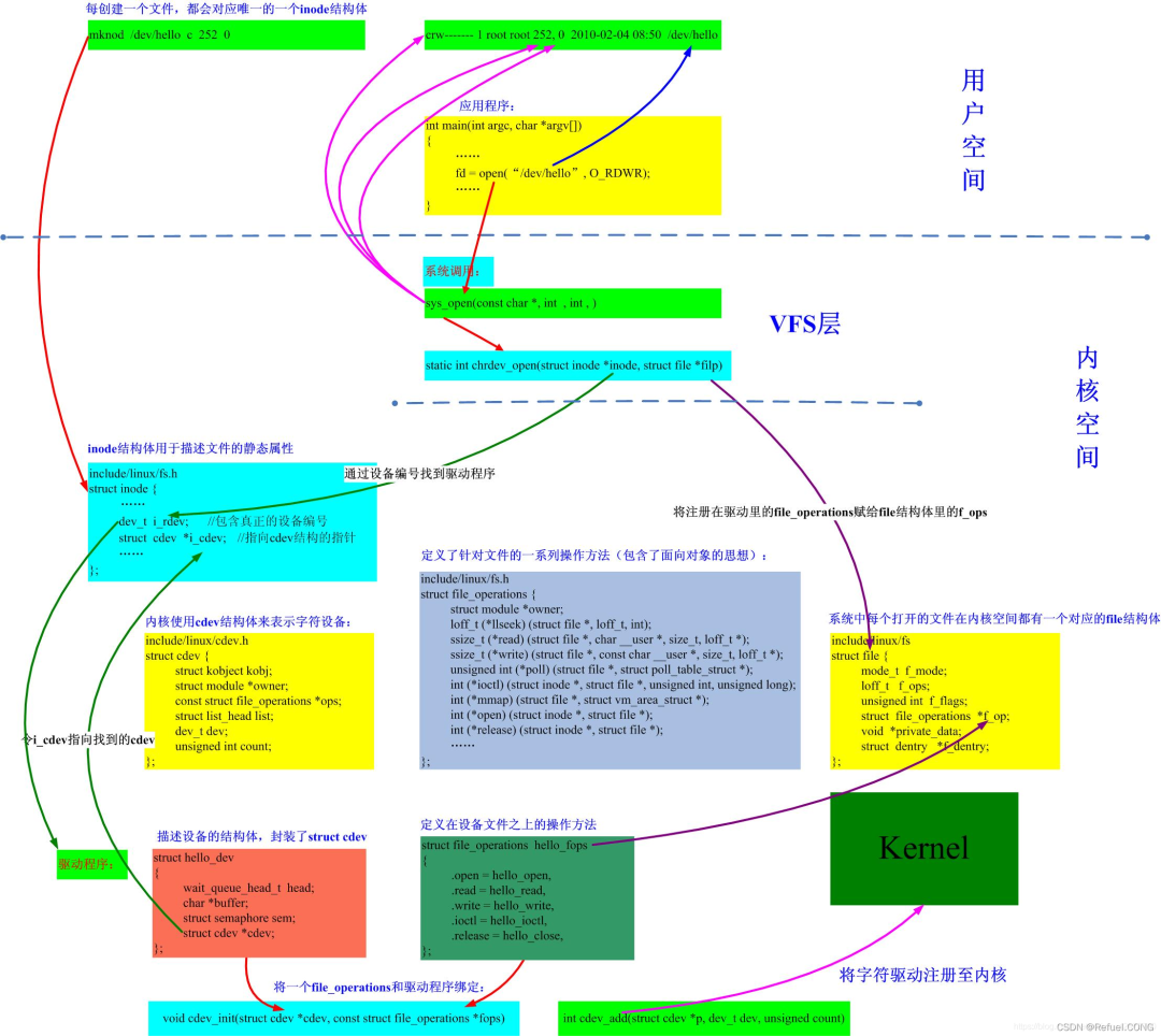 字符设备驱动工作原理在linux的世界里一切皆文件,所有的硬件设备操作到应用层都会被抽象成文件的操作。我们知道如果应用层要访问硬件设备,它必定要调用到硬件对应的驱动程序。Linux内核有那么多驱动程序,应用怎么才能精确的调用到底层的驱动程序呢?