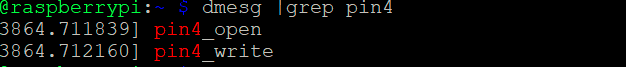 sudo chmod 666 /dev/pin4为pin4赋予权限,让所有人都可以打开成功。然后再次执行pin4test表面上看没有任何信息输出,其实内核里面有打印信息只是上层看不到如果想要查看内核打印的信息可以使用指令:dmesg |grep pin4。如下图所示:表示驱动调用成功在装完驱动后可以使用指令: