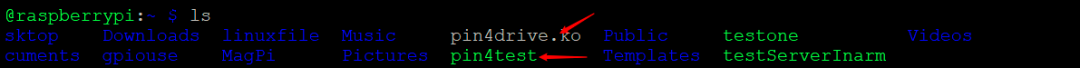 将pin4test.c (上层调用代码) 进行 交叉编译后发送给树莓派,就可以看到pi目录下存在发送过来的.ko文件和pin4test这两个文件,如下图所示: