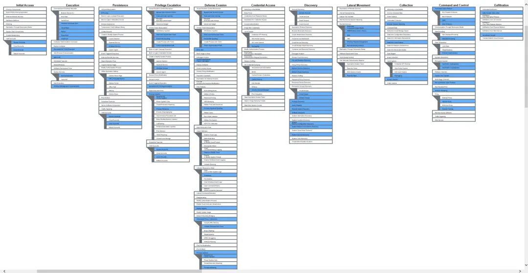 Cobalt Strike是一款渗透测试工具,简称为CS。它拥有多种协议主机上线方式,并集成了文件操作、命令执行、提权、凭据导出、端口转发、socket代理、宏病毒、文件捆绑、钓鱼等功能。其ATT&CK的官方映射如下图,可见CS从初始访问阶段(TA0001)横跨到渗出阶段(TA0010)都有覆盖: