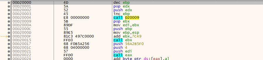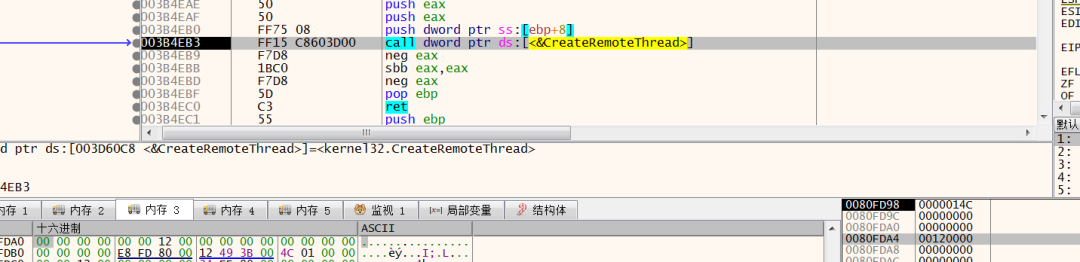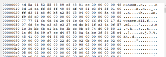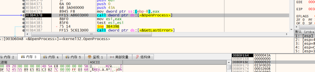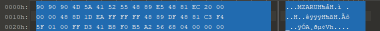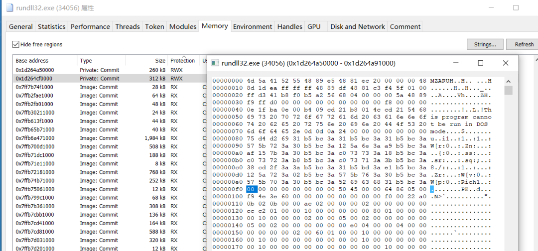 同时我们可以观察其内存区域的内容,可以简单通过MZ头标志进行匹配,但这样的不准确,cobalstrike可以通过配置在MZ增加nop或设置混淆选项进行绕过: