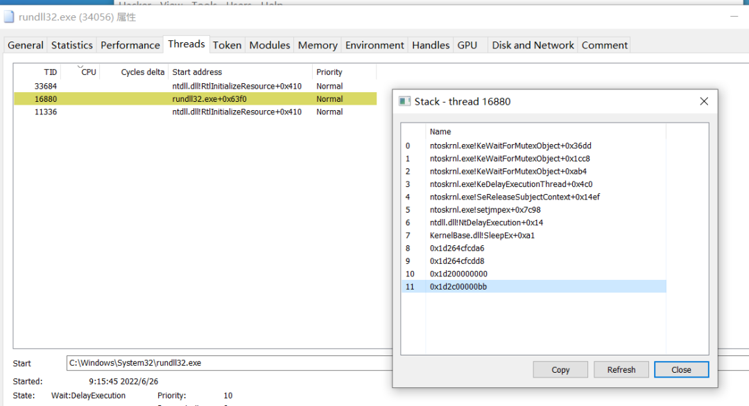 Cobaltstrike在spawn时默认会拉起rundll32进程并进行远程线程注入,而当在进程中的一个线程的起始地址没有关联到模块,同时该线程堆栈调用到sleepex()函数,这是值得我们去注意的。