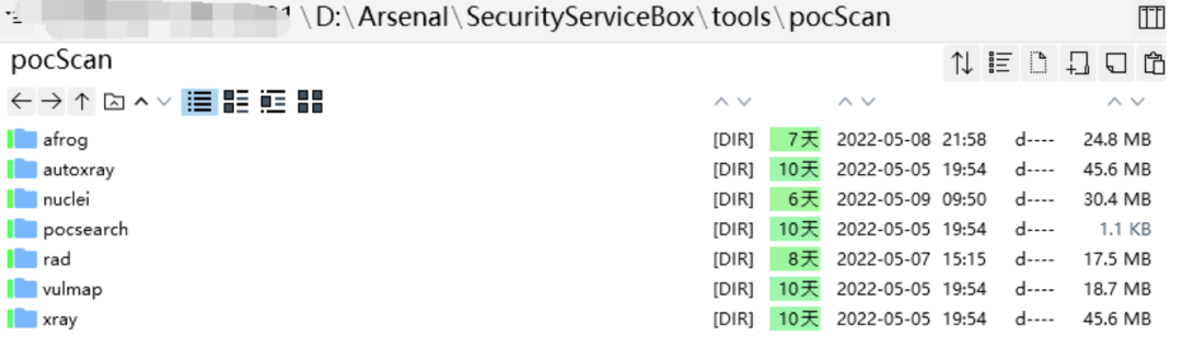 将工具下载至项目的tools文件夹下,可根据工具的功能进行分类,例如以下pocScan文件夹下存放的是nuclei、vulmap等poc扫描工具: