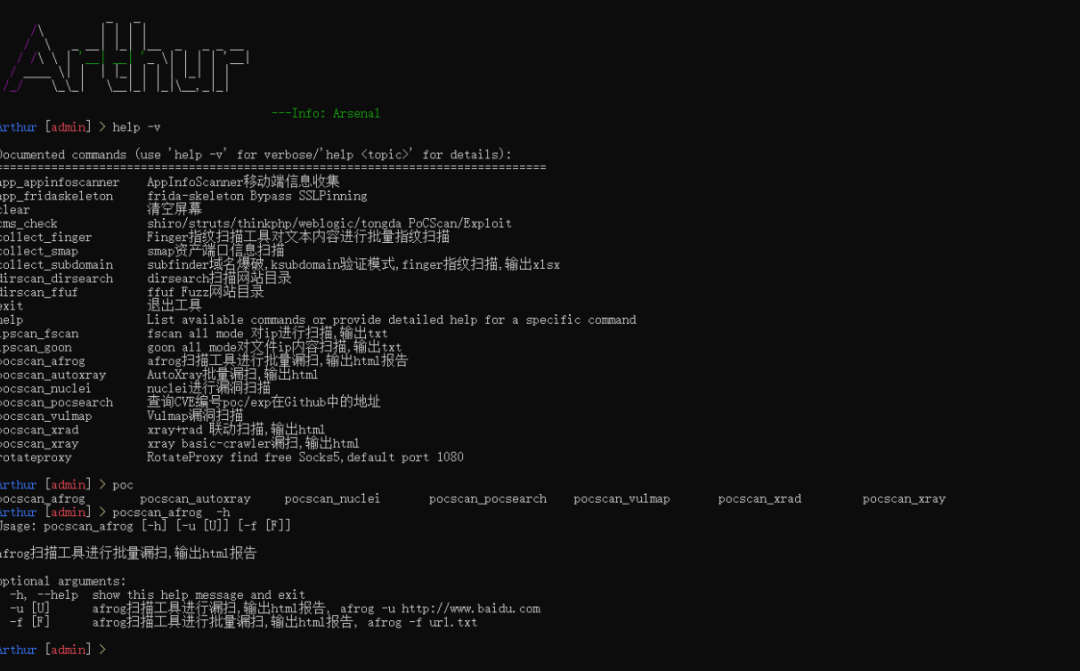 pocscan_nuclei_parser.add_argument("-p", nargs='?', help="设置socks代理进行批量漏洞扫描") @cmd2.with_argparser(pocscan_nuclei_parser)此时即可完成参数的注册及帮助信息。