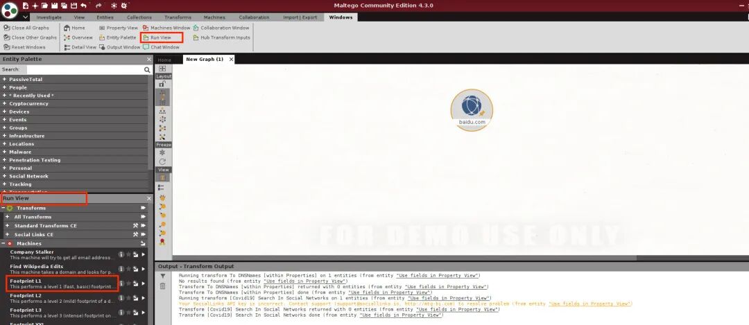单击“Run View”按钮之后,弹出来的“Machines”菜单中,列出了Maltego提供的几种比较经典的信息搜集方式,最为常用的是Footprint系列,其中后面的数字越大,调查的深度也越大,这里点击Footprint L1。