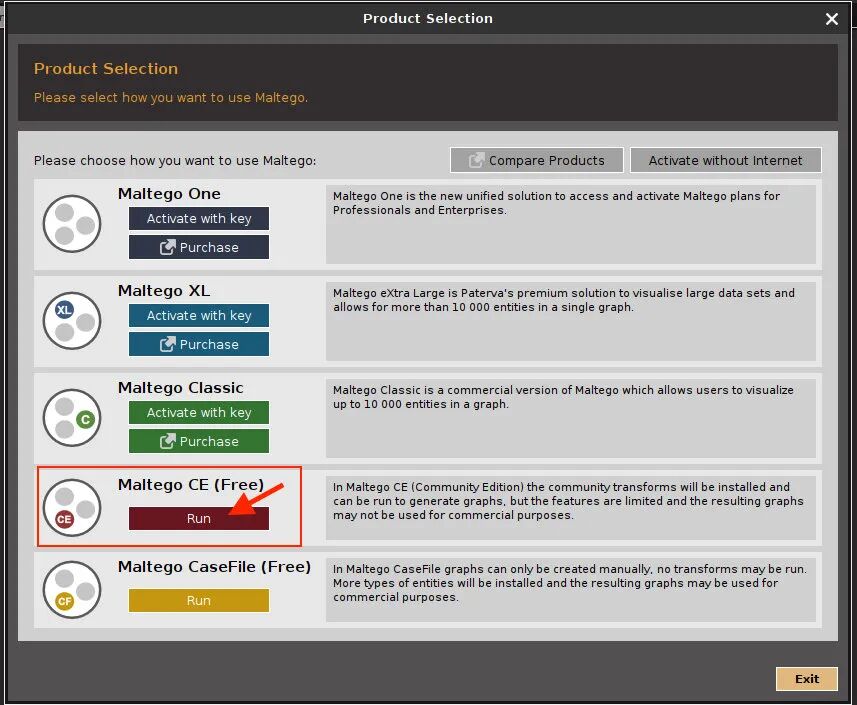 第一次启动Maltego时,出现如下的选择画面,我们选择红框的Maltego CE(Free),然后单击下面的“Run”按钮
