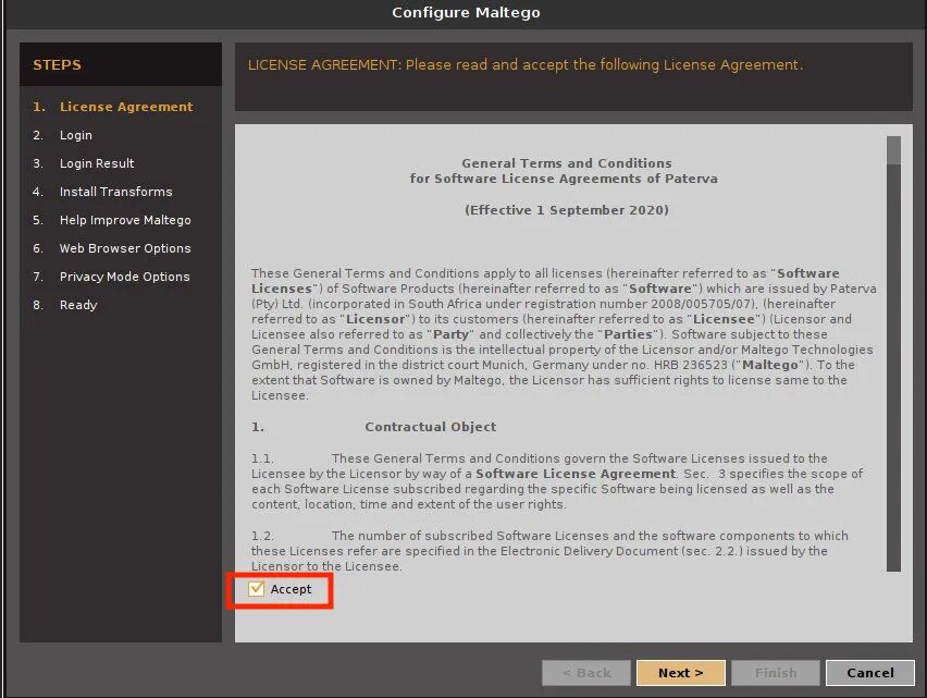 启动成功后,出现如下图的服务条款,勾选“Accept”即可。