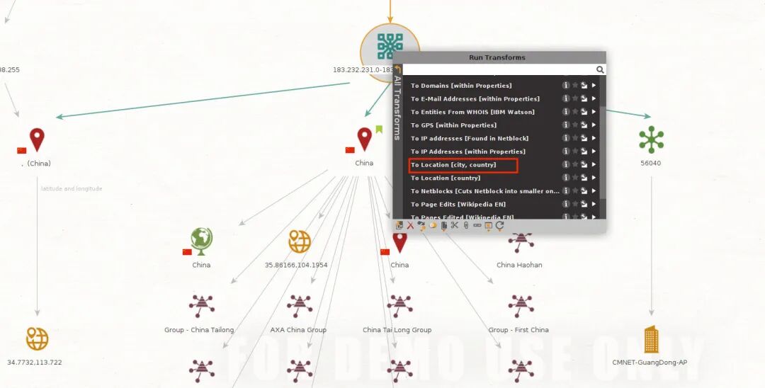 如果想知道IP地址183.232.231.0-183.232.231.255所处的地理位置,可以在这个节点上鼠标右键,然后在弹出快捷菜单中选择“To Location[city, country]”,就可以对这个位置进行定位。如下图所示: