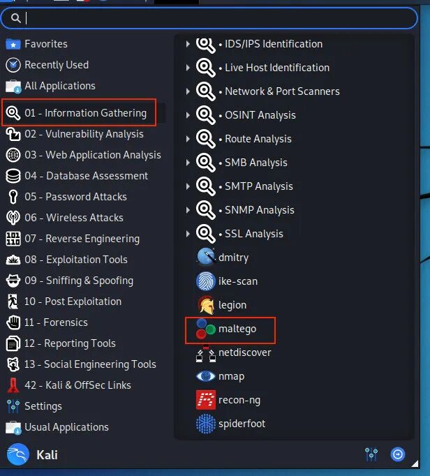 Kali 已经安装了Maltego, 点击“Applications”---------->“01-Infomation Gathering”---------->“maltego”就可以打开这个工具。