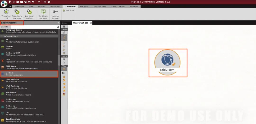 Maltego的使用是自动化的,因此只需要提供需要进行调查的内容,例如调查baidu.com这个域名。操作如下: