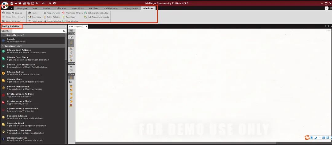 打开Maltego的工作界面分成3个部分,最上方的菜单栏包含所有的功能,左侧的“Entity Palette”包含所有的对象(如设备、域名、IP地址等),右侧是收集到的信息。如下图: