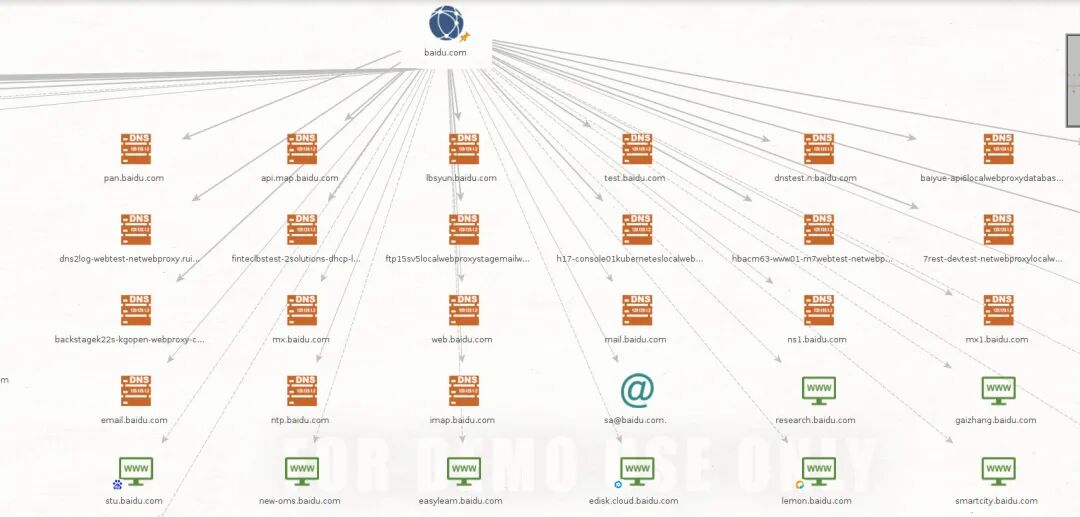 搜集到到的结果,有baidu.com的多个子域名,如下图所示:tieba.baidu.com、image.baidu.com、zhidao.baicu.com、smartcity.baidu.com等等