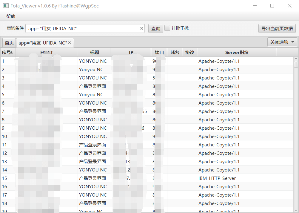 app="用友-UFIDA-NC"可以看到一共有9119条结果,接下来我们需要采集所有站点的地址下来,这里推荐狼组安全团队开发的fofa采集工具fofa-viewer