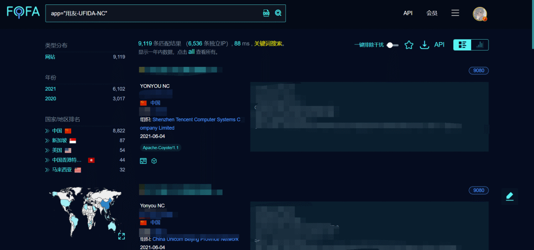 在知道这个漏洞详情之后,我们需要根据漏洞的特征去fofa里寻找全国范围里使用这个系统的网站,比如用友nc在fofa的搜索特征就是