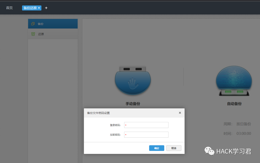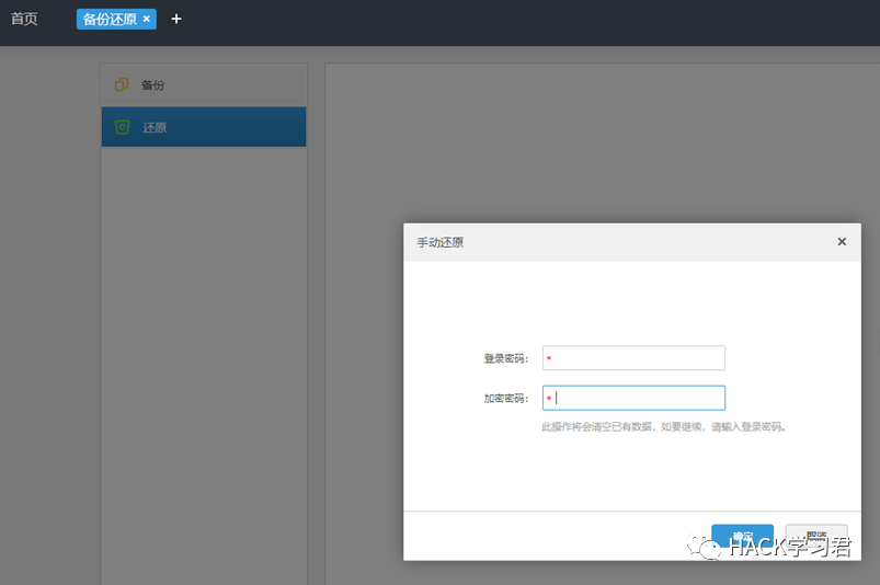 怀着*了狗的心情,又去看了下这里的还原功能,发现就是备份的逆逻辑,在你上传一个压缩包之前同样需要输入加密密码;于是猜测这里的加密密码后端是做了一些处理的,单纯的使用加密密码无法解压备份文件