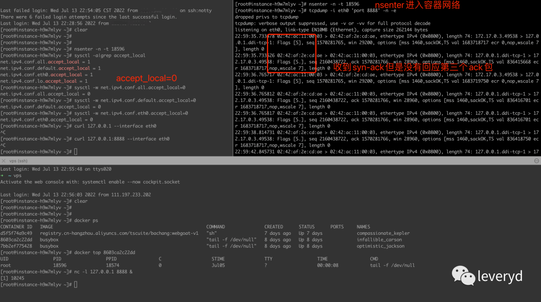 然后创建容器,并进入到容器网络命名空间,设置rp_filter=0、accept_local=1