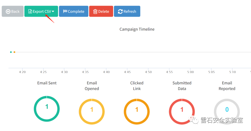 最后我们可以通过仪表盘来查看所有钓鱼的结果或者单次钓鱼的结果,通过export csv可以导出结果excel文件。