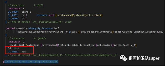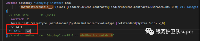6、然后搜索<GetBestAccount>b__0,删除IL_0000到IL_0019,并在IL_001e: ret前插入ldc.i4.1