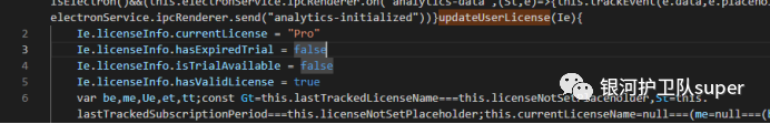 打开Fiddler Everywhere\resources\app\out\WebServer\ClientApp\dist\main.xxx.js文件,搜索updateUserLicense添加如下代码Ie.licenseInfo.currentLicense = "Pro"Ie.licenseInfo.hasExpiredTrial = falseIe.licenseInfo.isTrialAvailable = falseIe.licenseInfo.hasValidLicense = true