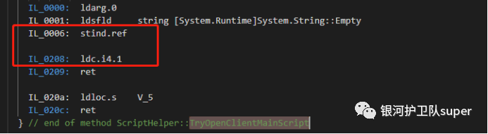 3、打开Fiddler.WebUi.il文件中搜索TryOpenClientMainScript函数,删除代码IL_0006到IL_0208的中间部分