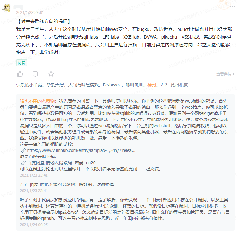 现在这么长时间过去了,相信绝大部分小伙伴的技术实力也得到了显著提升。我们也开始思考星球接下来的发展方向,是和以前一样继续录制视频?还是持续性文章的输出?显然这些都需要付出大量的时间,且无法覆盖各个技术层面的师傅们。于是,我们希望形成一种大家都能参与进来的学习模式—“提问+解答”的互动模式。