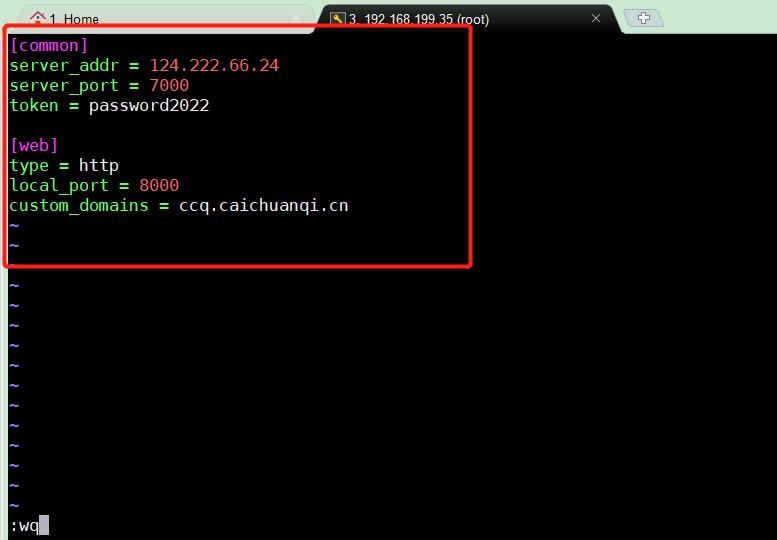修改 frpc.ini 文件,假设 frps 所在服务器的公网 IP 为 x.x.x.x: