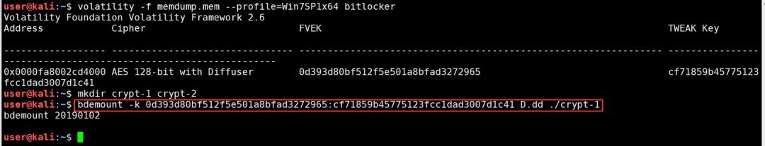 3)在kali里通过volatility与bitlocker.py插件提取内存镜像内的FVEK和TWEAK,执行命令