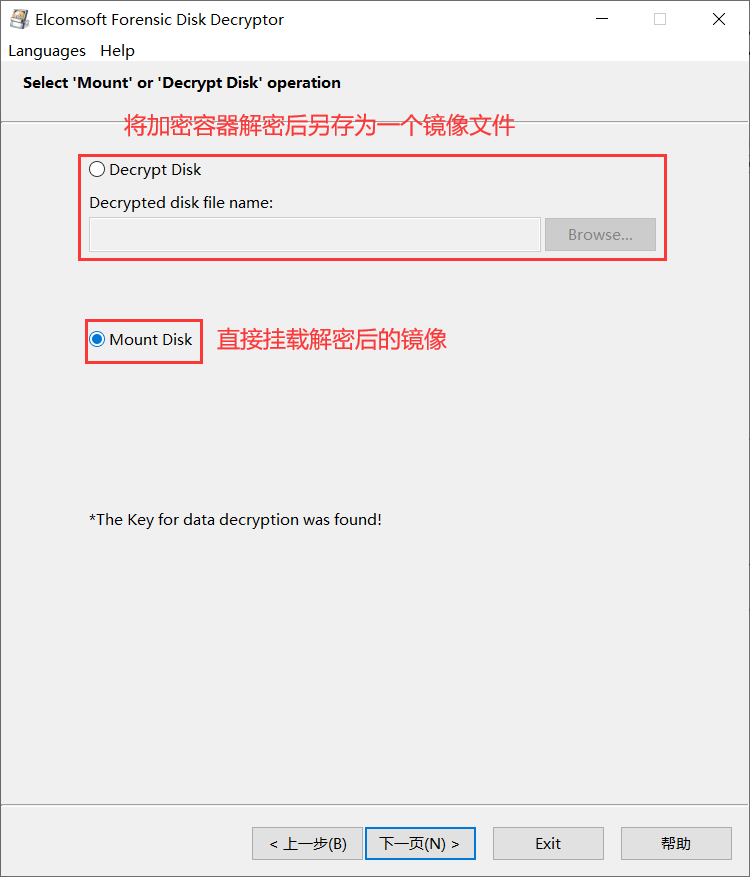 1)打开软件,选择“Decrypt or mount disk”,下一步,然后根据实际选择物理磁盘/分区或镜像,下一步: