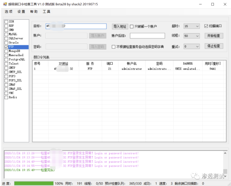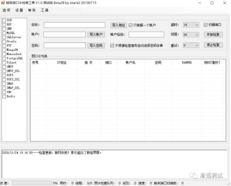 在渗透测试中,针对各项服务(FTP、RDP等)的爆破往往是繁琐的,一款好用的爆破工具,可以提高渗透测试的效率,超级弱口令检查工具(作者shack2)支持很多服务的爆破,支持批量导入爆破。