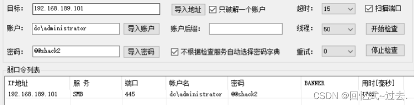 检查SMB服务一般需要开放445端口,如果需要检查域账号弱口令,需要在用户名前面加上“域名称\”。类似“dc\administrator”。
