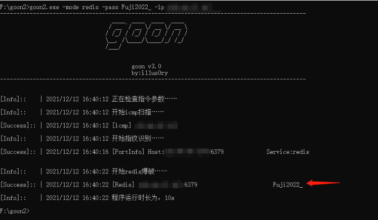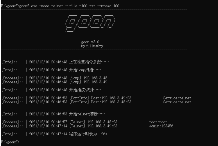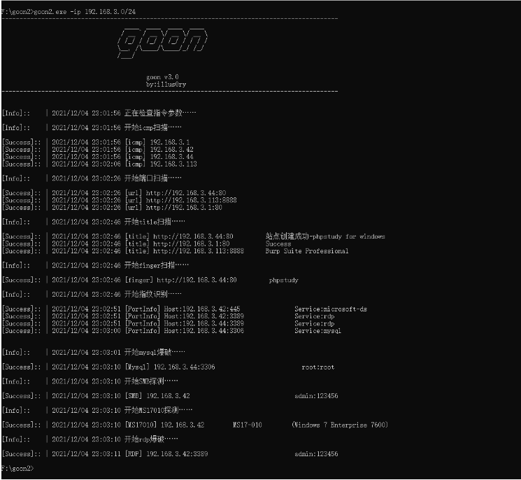 goon,集合了fscan和kscan等优秀工具功能的扫描爆破工具。功能包含:ip探活、port扫描、web指纹扫描、title扫描、压缩文件扫描、fofa获取、ms17010、mssql、mysql、postgres、redis、ssh、smb、rdp、telnet等爆破以及如netbios探测等功能。
