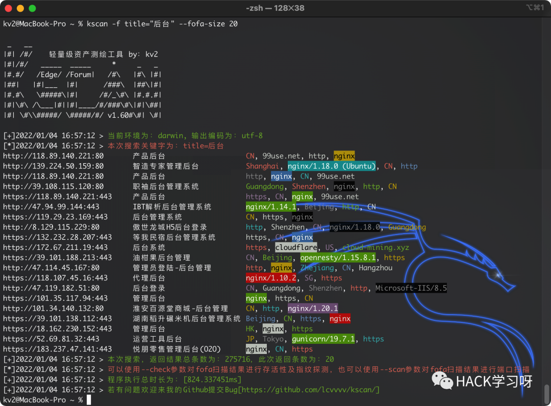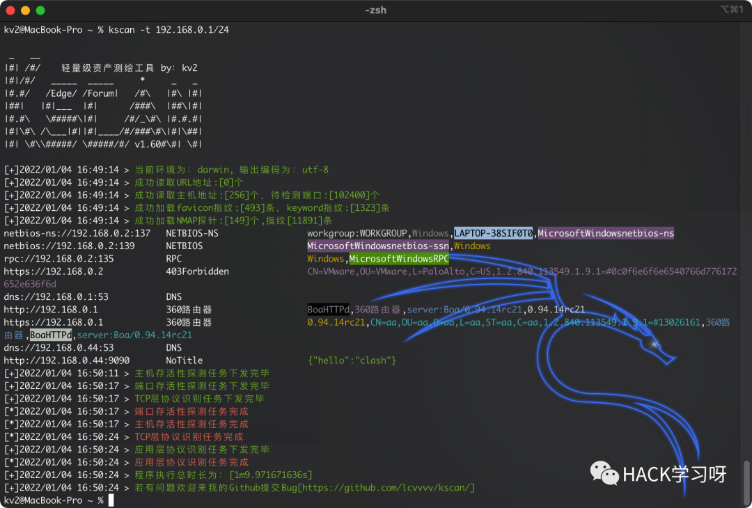 Kscan是一款纯go开发的全方位扫描器,具备端口扫描、协议检测、指纹识别,暴力破解等功能。支持协议1200+,协议指纹10000+,应用指纹2000+,暴力破解协议10余种。