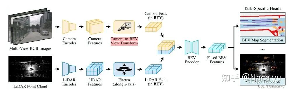 上述BEV融合的方式中,一种是以一种模态作为另一种模态的q去与另一种模态(作为k、v)做注意力并提取相应的特征用于融合,一种是将两种模态单独处理,转移到BEV视角中进行融合: