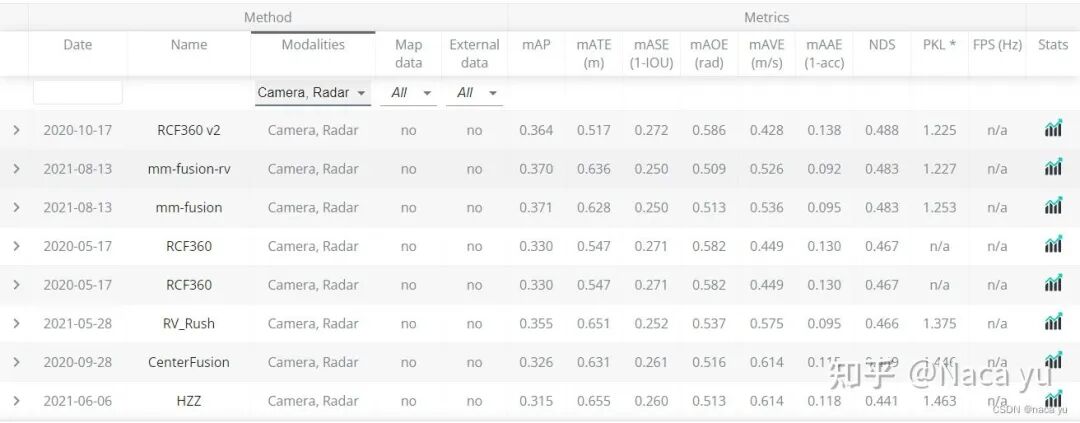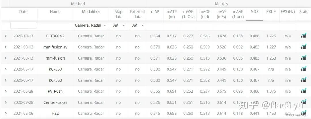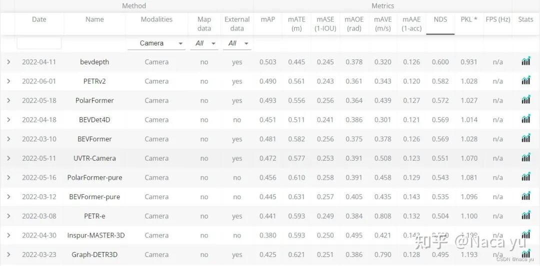 可以看到,下图中BEV检测的方法已经名列前茅,我猜测:一方面是由于BEV特征近期大火,学术界对于BEV的研究导致了最近的模型偏向于BEV,另一方面可能BEV特征更比FOV适合于自动驾驶场景下的3D目标检测。