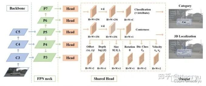 论文作者在FCOS基础上,对Reg分支进行部分修改,使其能够回归centerpoint的同时,加入其他指标:中心偏移、深度、3D bbox大小等,实现了将2D检测器用于3D检测器的跨越。除此之外,包括YOLO3D等工作,将传统的2D detector经过简单修改直接用于3D检测的方法,虽然修改取得了一定成效,但是图像本身缺乏精准的深度信息,加之结构并没有较之前的2D检测加入一定的先验结构,导致效果一般。