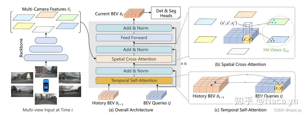 作者通过初始化一个HWC的规则、显式BEV queries作为queries。同时,加入了上一时刻的时序信息,当前时刻的空间信息。两个主要创新点模块伪:TSA和SCA,也就是时间注意力和空间注意力。具体来说,每一个时刻对上一时刻的BEV queries做deformable式的局部注意力,同时每一个grid划分为多个高度,同一方格的多个高度的方格对不同图像做空间局部注意力,最后生成原BEV queries大小的BEV特征作为下一帧的输入,同时作为特征图用于下游任务为地图分割和目标检测。